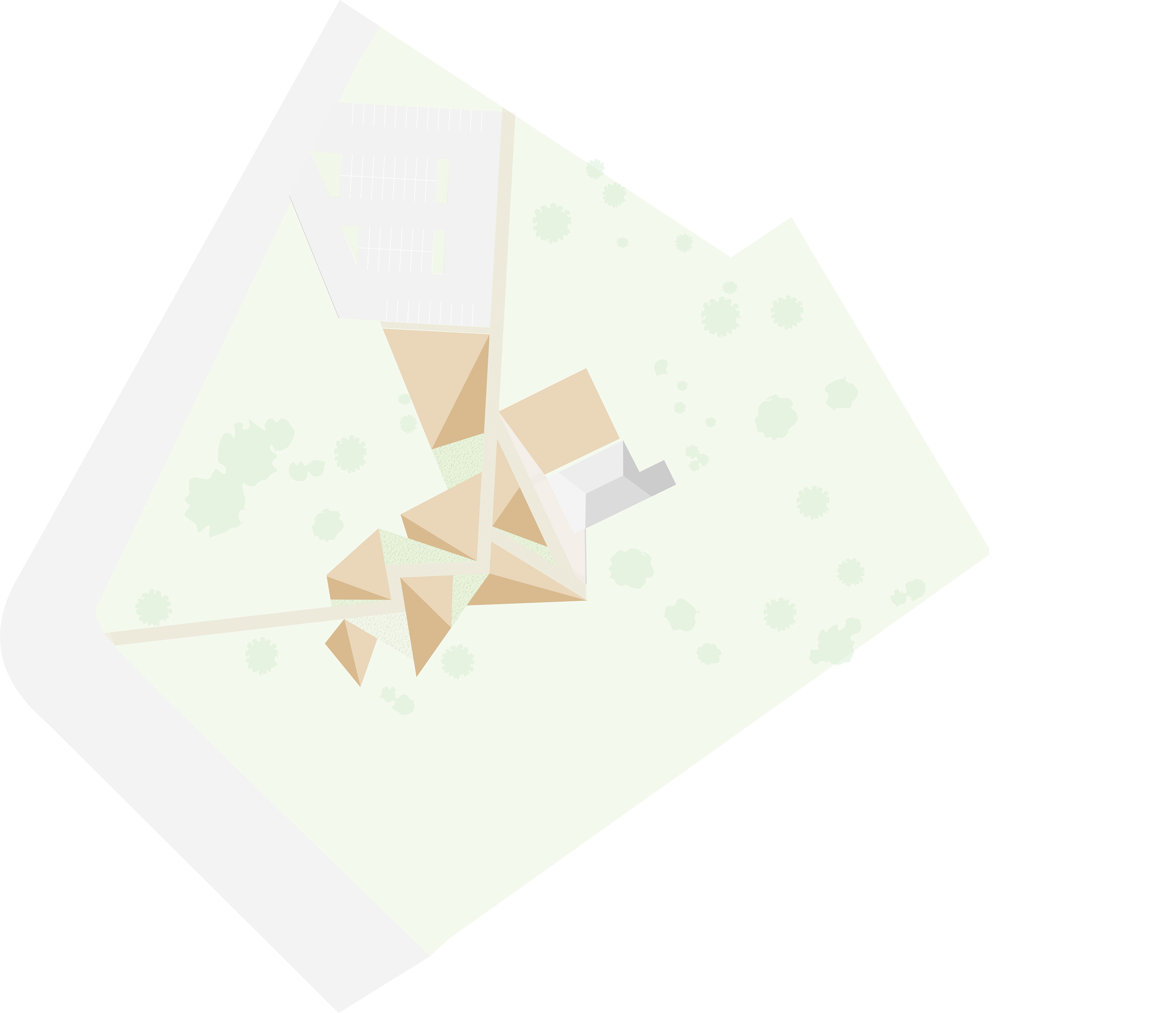 The response is a system of small buildings that are abstracted forms that direct views away from the plantation home. The rooms follow a linear path that is infilled with natural landscaping.